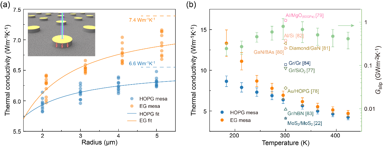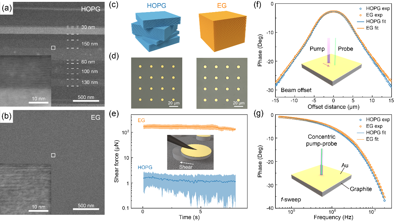 郑泉水院士团队与北京大学宋柏研究员等团队合作,首次实现了对于石墨结构超滑界面的热输运测量。研究团队选用高定向热解石墨(HOPG)中天然存在的旋转界面作为研究对象(图1),通过结合微纳加工形成石墨岛的技术与频域热反射法(FDTR),实现了对超滑界面的力学特性与热输运性质的同步表征。该研究采取了两套研究方案。首先利用北京大学刘开辉教授团队外延生长的无转角界面的高质量外延单晶石墨(EG),准确测量了两种石墨样品的面外方向热导率。通过热导率差异推算出HOPG中多个结构超滑界面的热阻总体贡献并由此估算出单个界面的热导(图2)。