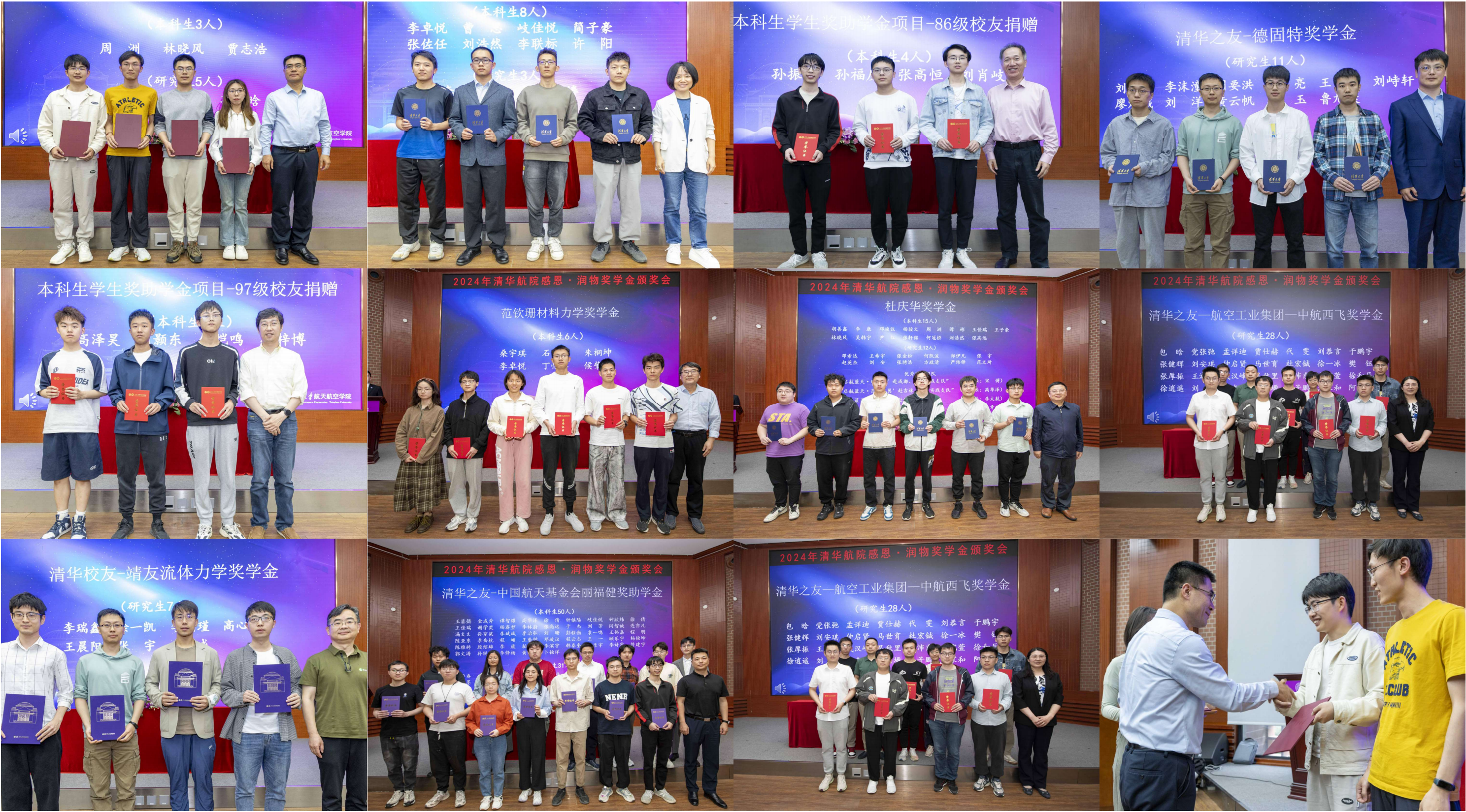 航院党委书记陈海昕宣读获奖学生名单。曹炳阳为获得“清华校友-过增元奖学金”的学生代表颁奖。刘应华教授、殷雅俊教授、中国航天基金会公益事务部副部长王强、完美世界高级副总裁,1997级校友林葱郁、清华大学核研院高级工程师,1986级校友傅激扬、李群仰副院长、中建环能科技股份有限公司副董事长,1986级校友倪明亮、葛东云副书记、青岛德固特节能装备股份有限公司研发部长金延超、北京中航智科技有限公司总裁助理田圣宽,分别为“杜庆华奖学金”“范钦珊材料力学奖学金”“清华之友-中国航天基金会丽福健奖助学金”“清华校友-航院葱郁奖学金”“本科生奖助学金项目-86级校友捐赠”“本科生奖助学金项目-97级校友捐赠”“清华校友-靖友流体力学奖学金”“清华之友-航空工业集团-中航西飞奖学金”“清华之友-德固特奖学金,并鼓励航院学子学有所成,为国家航天航空事业的发展贡献清华力量。
