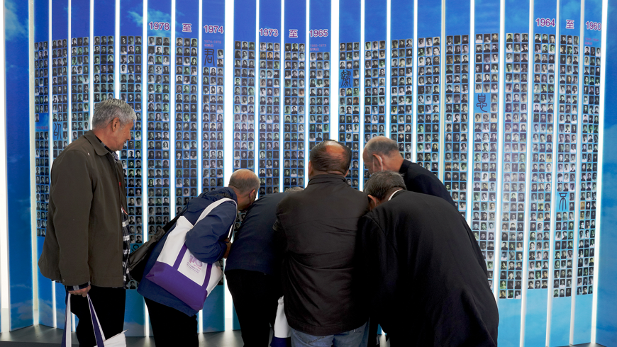 图6 学长们驻足在航院校友墙前,仔细欣赏自己入学时的照片,感慨良多