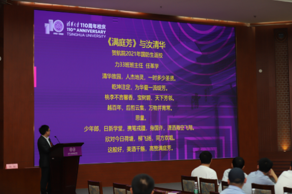 接着,王锡瑞、任革学对校友们的返校表示欢迎,并希望大家在军口、民口、地方各个领域继续绽放光芒,坚持理想,秉持清华优良传统,为国争光。任革学为本次活动专门创作了题为“《满庭芳》 与汝清华”的诗,并在现场与校友分享,令参会校友深受鼓舞。