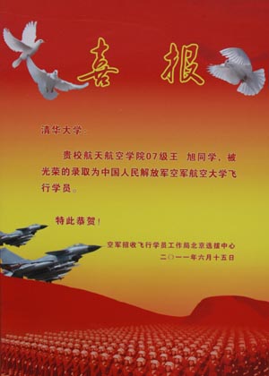 我院国防班航74班王旭同学,在中国人民解放军空军招飞局的选拔中以总分北京地区第1名、全国第10名的优异成绩,成为清华大学建国以来从学生到空军飞行员第一人。为此我院获得了招飞局的嘉奖。这是王旭同学的光荣,也是我们航院全院师生的光荣。