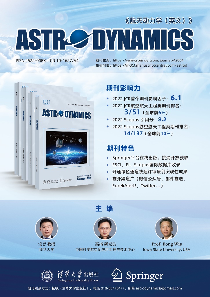 《航天动力学(英文)》(Astrodynamics)创刊于2017年9月,由清华大学主办,航院提供学术支撑,清华大学出版社出版,Springer公司负责海外发行,清华大学航院教授宝音、中国科学院研究员高扬、美国爱荷华州立大学教授魏烽(Bong Wie)等三人共同担任主编。目前,该刊拥有由31位国内、国际专家学者组成的编委会,其中国际编委17人(55%)。国内编委主要是活跃在该领域的年富力强的中青年学者,清华大学航院教师宝音、蒋方华,以及龚胜平、姜宇、曾祥远等航院校友均具有在该领域国际顶级期刊发表过高水平论文和参加我国航天工程重大项目的经历。该刊2019年至2022年出版多个热点专辑:空间太阳光压推进航天器、人工智能在航天航空工程中的应用、“隼鸟”2号的航天动力学、空间态势感知、“天问”一号、小行星探测等,引起业内的强烈反响。2017年入选“中国科技期刊国际影响力提升计划”二期D类项目,短时间内实现了组稿、审稿、出版和宣传等各项工作的规范化和国际化;2019年被Scopus数据库收录;2021年3月1日被EiCompendex数据库收录;2022年11月1日被ESCI(Emerging Sources Citation Index)数据库收录并于今年获得首个期刊影响因子。