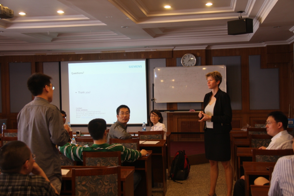 下午,西门子美国研究中心的安特莱博克(Antje Lembcke)在技科楼1512多功能报告厅作报告,介绍在全球碳减排环境下燃气涡轮发电研发技术需求的前景。热能系、航院和材料系的30多位学生听取讲座并进行了交流。