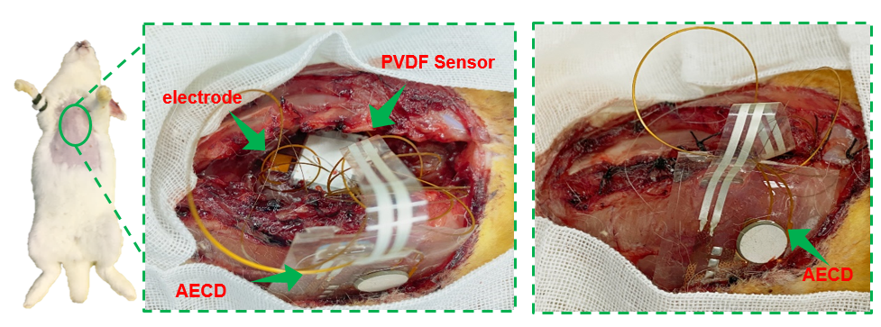冯雪课题组还开展了在体动物实验,以验证该系统作为植入式心脏起搏器的应用场景。系统植入后接收超声波而开始工作,通过内置的PVDF传感器来采集心脏跳动信息,根据预编入的程序判断心脏的跳动状态,当监测出异常跳动时给与心脏电刺激作为电学治疗以实现心脏跳动再同步化的治疗目的。
