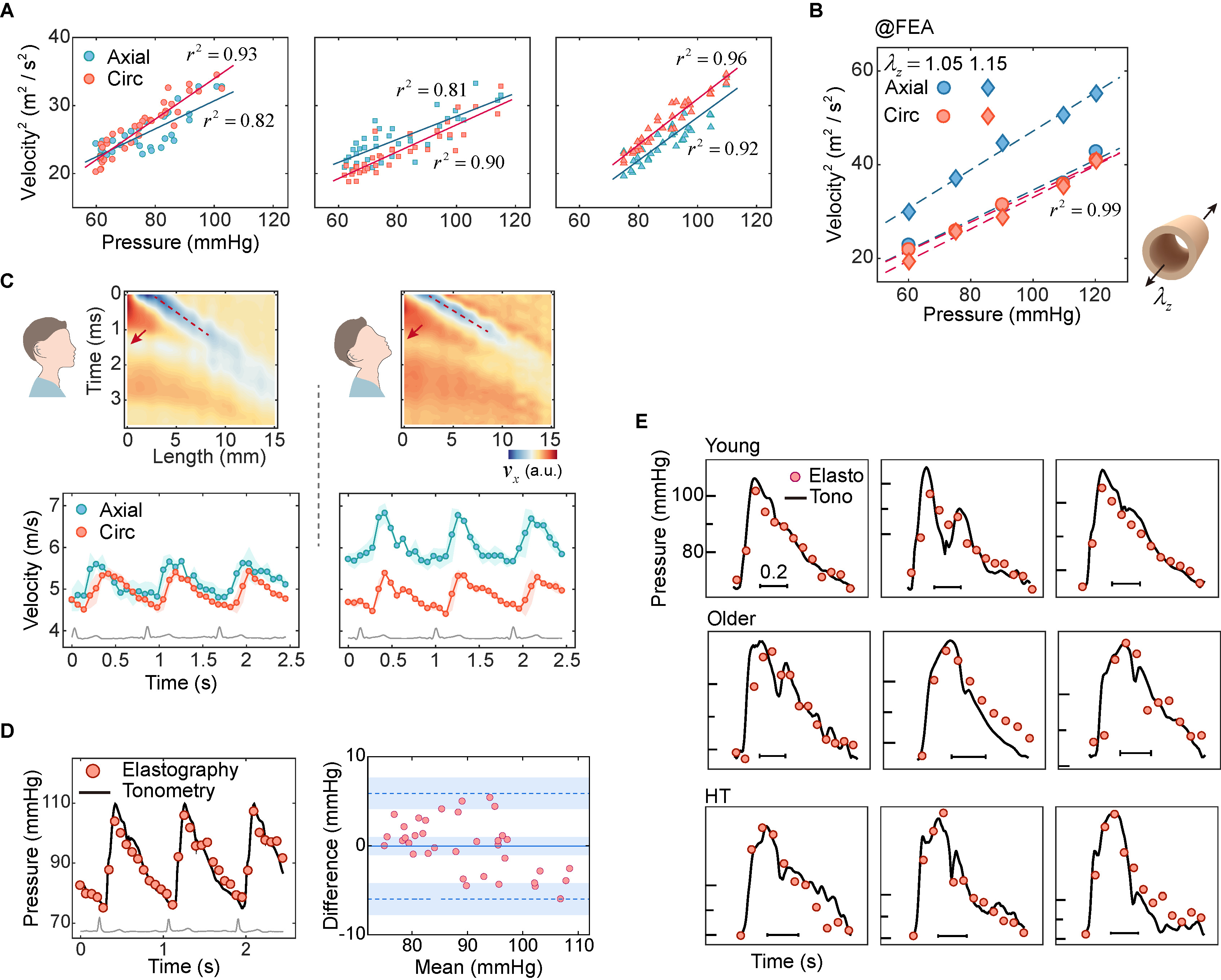 图2.连续无创血压测量。(A)三名年轻志愿者的轴向及环向导波波速的平方与血压的关系。(B)有限元仿真结果用于验证双向波速平方与血压之间的线性关系,并对比两种轴向伸长比(也即两种体姿)下的波速变化。(C)两种体姿的对比实验:正常体姿(平视)与伸颈体姿(抬头)。左上:正常体姿下舒张末期的质点时空速度图;右上:伸颈体姿下的质点速度图;左下:正常体姿下的双向波速;右下:伸颈体姿下的双向波速。(D)一名年轻志愿者的血压测量结果,将基于环向导波波速的血压测量方法与压平测量法进行对比(左侧),并给出两种方法的一致性分析图(右侧)。(E)来自九名志愿者的血压测量结果,涵盖年轻组、中老年正常血压组和中老年高血压组
