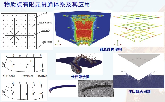 1. 提出了杂交/耦合/自适应物质点有限元法,建立了物质点无网格法与有限元法的贯通理论体系,实现了复杂结构体的高保真计算和准确高效的材料局部化破碎模拟。