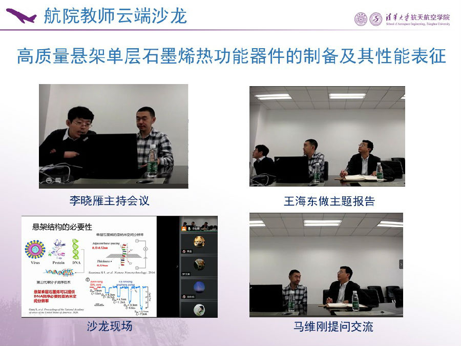 2020年10月20日上午10:30,航院教师云端沙龙成功举办,青年教师工程热物理研究所副所长王海东通过网络腾讯会议的方式,做了题为“高质量悬架单层石墨烯热功能器件的制备及其性能表征”的主题报告。航院工程热物理研究所马维刚作为嘉宾出席,清华师生、校友及该领域的科技工作者近50人参加了本次沙龙活动。本次沙龙活动由航院固体力学研究所副所长李晓雁主持。