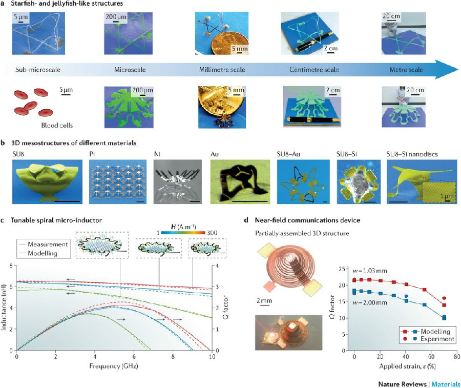 在过去几年里,张一慧副教授课题组及其合作者创新建立了一种力学引导的微尺度三维结构组装方法,并从设计概念、力学理论、组装平台和器件应用等方面开展了大量研究。该方法将屈曲力学的概念与现代化半导体产业中成熟的平面制备工艺相结合,将二维薄膜图案通过压缩力的作用变形成目标三维结构,适用于各种材料(包括半导体硅、金属、陶瓷、聚合物等)和各个特征尺度(从纳米至分米)的快速成形,为不同学科的科研工作者发展新型三维微器件(如电子、能源、生医、光学器件等)提供了一个创新平台。该系列成果是张一慧副教授、约翰·罗杰斯教授课题组通力合作的结果,自2015年以来相继在《科学》(Science)(封面文章)、《美国科学院院刊》(PNAS)、《科学进展》(Science Advances)等国际期刊上发表多篇文章,引起了学术界的广泛关注和报道。鉴于张一慧副教授课题组及其合作者在三维微结构组装领域的贡献,《自然综述—材料》杂志专门邀请这一国际研究团队撰写关于三维细微观结构成形方法的综述论文。该论文系统阐述了细微观尺度下复杂三维结构的打印、折叠和力学组装方法,以及利用这些方法实现的广泛应用,重点介绍了这一领域的最新进展和发展趋势,并对面临的挑战和存在的问题进行了展望。