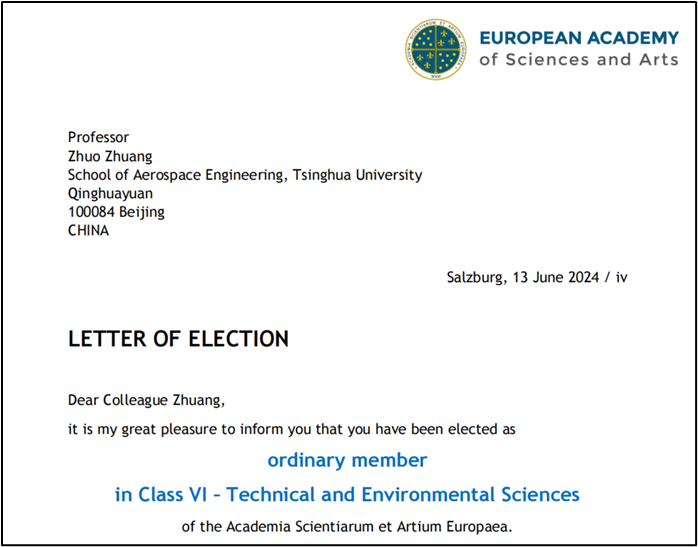 近日,清华大学航天航空学院教授庄茁收到欧洲科学与艺术学院(European Academy of Sciences and Arts)院长克劳斯·美因泽(KlausMainzer)教授发来的贺信,经理事会投票,庄茁当选为欧洲科学与艺术学院院士(技术与环境科学学部)。