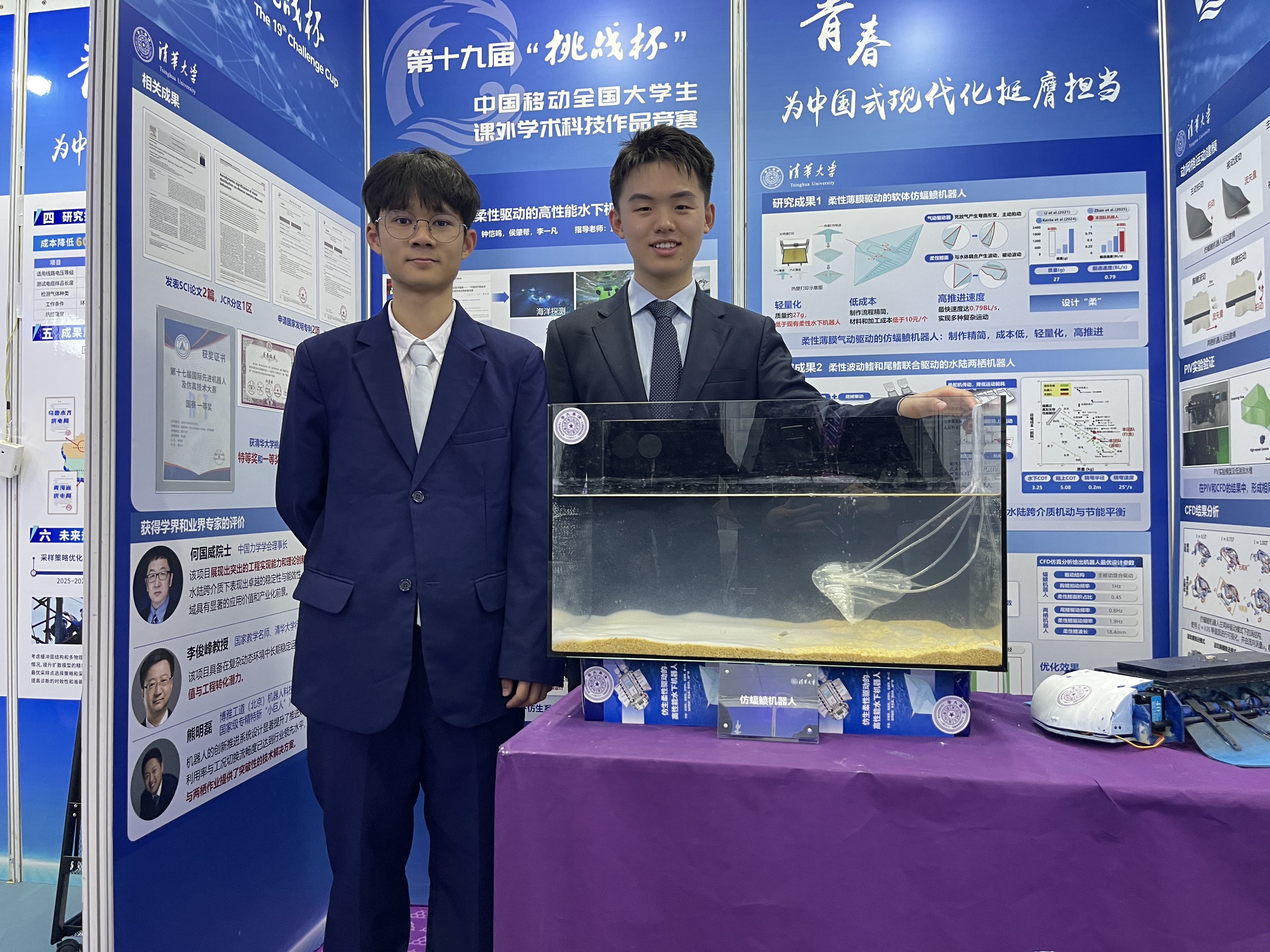 11月3日,第十九届“挑战杯”全国大学生课外学术科技作品竞赛(以下简称:“挑战杯”竞赛)在南京大学落幕,清华大学以全国第一的成绩,第八次捧起“挑战杯”。其中,由清华大学航天航空学院贾永霞老师、黄伟希老师和北京大学工学院谢广明老师指导,彭靖舒、梁志铨、钟恺鸣、侯肇帮和李一凡共同完成的本科生参赛作品“仿生柔性驱动的高性能水下机器人”荣获主体赛一等奖。航天航空学院钟恺鸣同学代表项目团队在答辩现场进行汇报,并在“挑战杯”大学生科技创新成果展上接受了江苏共青团现场采访,尽显青年科创风采。