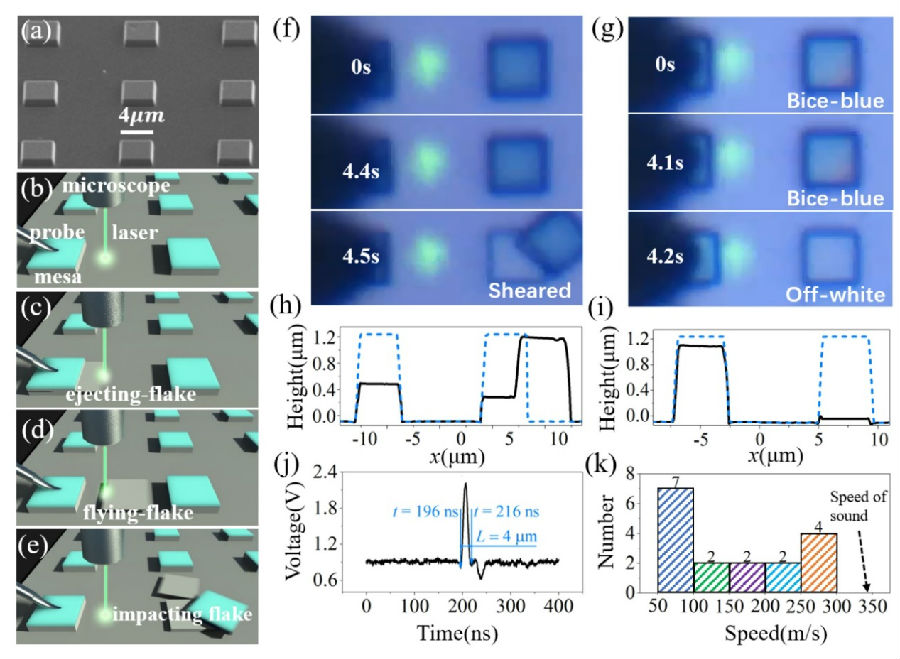 正压力下石墨岛内的石墨片层高速滑出现象。(a)石墨岛的电镜图片;(b)-(e)采用激光刀口法进行的速度测量示意图;(f)受压的石墨岛(左边)内片层飞出将右侧石墨岛的岛盖(蓝色部分)剪切开;(g)受压的石墨岛(左边)内片层飞出时将右侧石墨岛的岛盖击飞带走;(h)-(i)对应于(f)-(g)中受压的石墨岛内的片层飞出前(蓝色虚线)和飞出后(黑色实线)的高度截面图(AFM测量图);(j)一个典型的采集到的石墨片层飞出时的光强信号变化;(k)测量得到的石墨片层高速飞出的速度分布统计图。