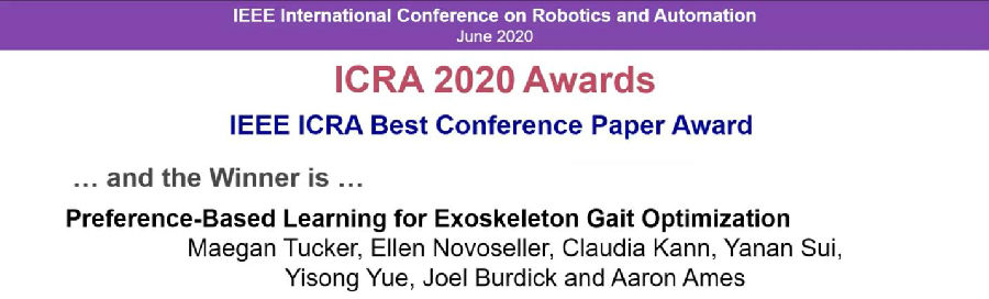助理教授眭亚楠与美国加州理工学院的合作者发表了题为“基于偏好反馈的外骨骼步态优化学习”(Preference-Based Learning for Exoskeleton Gait Optimization)的研究论文,获得大会唯一最佳论文奖,并同时获得最佳人机交互论文奖。
