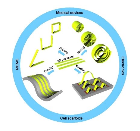 航院张一慧副教授团队在国际材料科学领域知名学术期刊《先进材料》 (Advanced Materials)上在线发表了综述文章《通过卷曲、折叠、共形和屈曲方法实现微纳尺度三维组装》(Micro/Nanoscale 3D Assembly by Rolling, Folding, Curving, and Buckling Approaches),系统回顾了微纳尺度三维组装领域的最新进展,综述了三维微纳结构在电子/光电子器件、微机电系统、医疗器件和细胞支架等领域的应用。在此基础上,该文章对三维微纳组装技术的现有挑战与发展机会进行了展望。