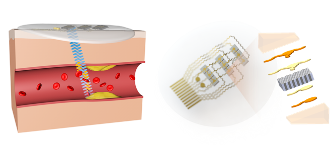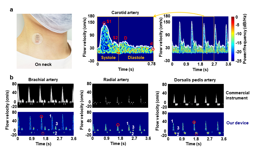 心血管疾病是全球第一大死因,据世界卫生组织预测,到2030年将有约2360万人死于心血管疾病,长期连续监测血流速度对心血管疾病防治具有重要意义。例如,颈动脉在高血压、高血脂等因素作用下往往会出现一定程度的硬化而形成硬化斑块,容易引发脑卒中危险,准确判断管腔狭窄程度是预警斑块脱落和防治脑卒中最重要的方法之一,但当前可持续监测血管狭窄状况的技术手段十分缺乏。基于光容积描记术或热分析的技术只能提供相对的流量变化,探测深度很浅;而传统的超声设备体积大、材质刚性,存在固定困难、接触变形大、无法与人体表面良好耦合和难以连续监测等缺点。