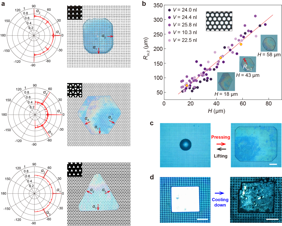 实验中,该团队发现当使用百微米高、尺寸和间距在十微米量级的周期性表面微柱结构时,液滴在受压后(图1a)表现出独特的行为:增加压力的过程中,液滴始终处于Cassie状态,并形成特定的图案化液膜(图1b-e);即便压板接触到了微结构顶部(图1a),液滴也不坍塌成Wenzel状态,而是始终“悬挂”在微结构顶部(边缘)。特别有意思的是,随压力逐渐释放,液滴总会自发恢复并最终回到原来的小液滴Cassie润湿状态。进一步发现,这种“可逆”行为对水滴(图1b-d)和金属液滴(图1e)均表现出良好的适用性。研究还揭示了受压过程中固-液-气三相接触线移动所要克服的能量势垒具有各向异性是其产生多边形的原因(图2a);多边形图案的边数主要由微结构的排列方式所决定、其角点所能达到的最大曲率由微结构的间距所控制(图2b)。实验表现出了良好的可重复性(图2c)。此外,利用低温技术降低液膜温度,当释放压板后,多边形液膜图案可以被“固定”下来(图2d)。