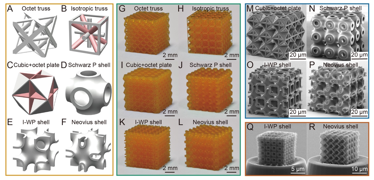 图1.多种桁架、平板和曲面单胞结构以及制备得到的不同特征尺寸的微纳米点阵材料