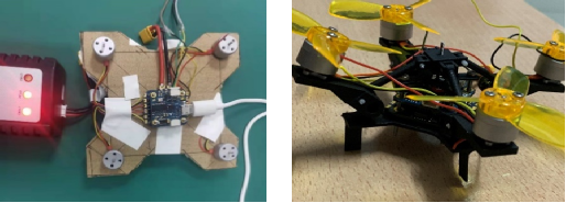 微型飞行器具有重量轻、尺寸小、便于携带、隐蔽性好等性能特点,由于其具有的特殊的飞行性能以及应用前景,正受到越来越多的各国军方和民用部门科研人员的重视。作为微型飞行器中十分具有代表性的一种类型,微型四旋翼飞行器在军事及民用领域均展现出了广阔的应用前景。在军用方面,微型四旋翼飞行器具有良好的隐蔽性,可随时随地起飞,可担负侦察与通讯等任务;在民用方面,微型四旋翼飞行器可提高抢险救灾时的搜索精度,可以对危险地带以及人类难以进入的狭小环境进行探查,依靠其尺寸小、易控制的优点完成较为困难的任务。也正是由于其较轻的重量和较小的尺寸,其抵抗侧风的能力不佳,易发生偏航,通过改变不同电机转速来实现姿态调整效率偏低。基于这一不足,小组设计了可倾转旋翼式的四旋翼飞行器,四个旋翼通过电机带动传动机构实现同步倾转,遇到侧风时旋翼由水平转为倾斜,通过倾斜所产生的水平方向分力抵抗侧风的影响,实现姿态稳定的目的。